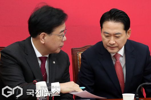 (서울=국제뉴스) 장동혁 국민의힘 대표와 송언석 원내대표가 12일 서울 여의도 국회에서 열린 최고위원회의에서 대화하고 있다./사진=이용우 기자