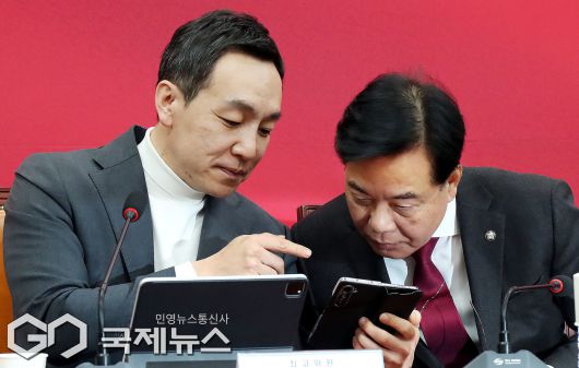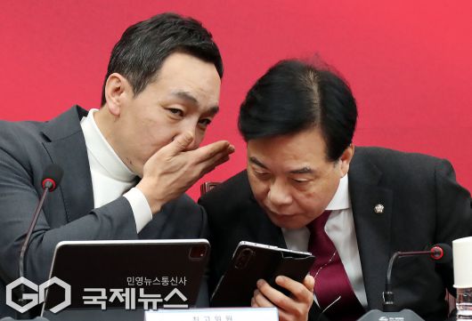 (서울=국제뉴스) 12일 서울 여의도 국회에서 열린 최고위원회의에서 송언석 원내대표와 김민수 최고위원이 스마트폰을 보며 대화하고 있다./사진=이용우 기자