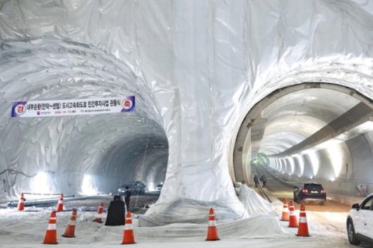 최근 공개된 공사 현장에서는 차선 도색과 내부 정비, 시설 점검 작업이 진행되고 있었다. 반원형 구조의 터널 상부에는 대형 환기팬과 공기 흡·배기시설이 설치돼 있고 천장 중앙부에는 화재 발생 시 연기를 감지해 외부로 배출하는 제연설비가 일정 간격으로 배치돼 있다.