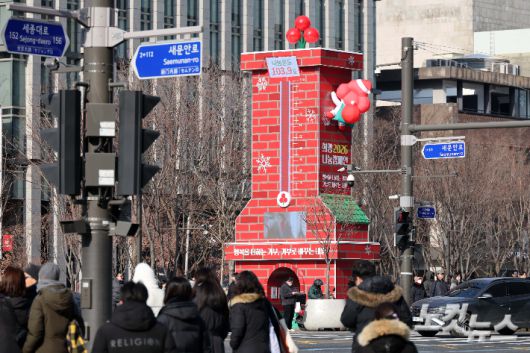 12일 서울 종로구 광화문 광장에 설치된 사랑의 온도탑에 나눔 온도가 103.9도를 나타내고 있다.