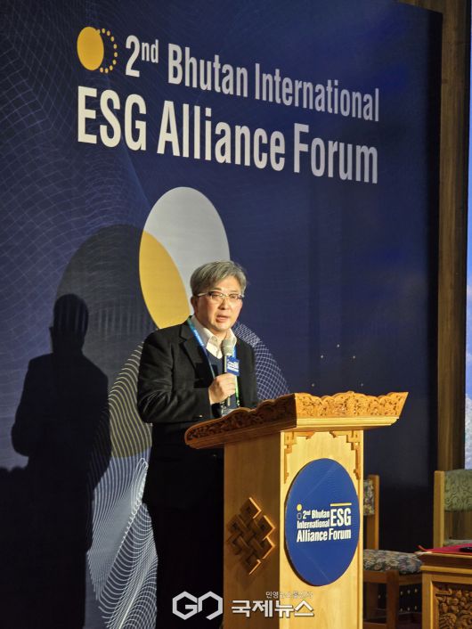 (부탄=국제뉴스) 유지현 기자 = 9일 부탄 팀푸시 부탄왕립대학교(RUB)에서 열린 제2회 부탄 국제 ESG 동맹포럼(The 2nd Bhutan International ESG Alliance Forum)에서 유희동 연세대학교 특임교수(전 기상청장)이 '부탄의 기후변화 영향과 대응 전략'을 주제로 기조강연을 했다.