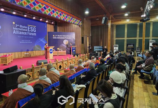 (부탄=국제뉴스) 유지현 기자 = 9일 부탄 팀푸시 부탄왕립대학교(RUB)에서 열린 제2회 부탄 국제 ESG 동맹포럼(The 2nd Bhutan International ESG Alliance Forum) 개막식에서 김민경 한국부탄우호협회 회장이 환영사를 했다.
