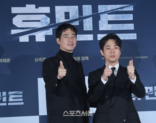 조인성, 박정민이 12일 서울 성동구 롯데시네마 건대입구에서 열린 영화 ‘휴민트’ 제작보고회에서 포즈를 취하고 있다.