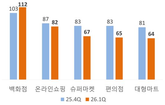 백화점의 경우 전망치는 지난해 4분기보다 높은 112로 유일하게 기준치를 웃돌았다. ‘K-푸드·뷰티·패션’과 같은 한류 열풍에 고환율로 인한 원화 약세 현상이 더해지면서 해외 관광객들의 지갑이 열리고 있는 것으로 대한상의는 분석했다. 아울러 경기 불황에 흔들리지 않는 명품 충성도, 겨울 의류 판매 호조세 또한 탄탄한 성장세에 대한 기대감을 키웠다.