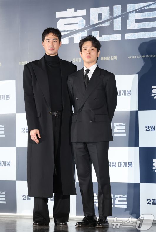 (서울=뉴스1) 권현진 기자 = 배우 조인성과 박정민(오른쪽)이 12일 서울 광진구 롯데시네마 건대입구에서 열린 영화 '휴민트‘(감독 류승완) 제작보고회에 참석해 포즈를 취하고 있다. '휴민트'는 비밀도, 진실도 차가운 얼음 바다에 수장되는 블라디보스토크에서 서로 다른 목적을 가진 이들이 격돌하는 이야기를 그린 작품이다. 2026.1.12/뉴스1
