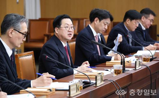 대전시청에서 열린 주간업무회의에서 이장우 대전시장을 비롯한 간부들이 대전·충남 통합 논의와 주요 시정 현안을 놓고 회의를 진행하고 있다 |