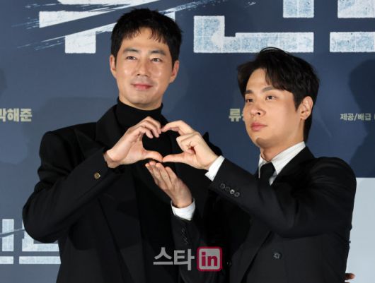 [이데일리 스타in 방인권 기자] 배우 조인성(왼쪽)과 박정민이 12일 서울 광진구 롯데시네마 건대점에서 열린 영화 '휴민트' 제작보고회에 참석해 포토타임을 갖고 있다.