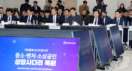 (세종=뉴스1) 김기남 기자 = 12일 세종시 정부컨벤션센터에서 열린 중소벤처기업부 산하기관 업무보고에 참석한 기관장들이 자료를 검토하며 업무보고 준비를 하고 있다. 2026.1.12/뉴스1kinam@news1.krCopyright ⓒ 뉴스1. All rights reserved. 무단 전재 및 재배포, AI학습 이용 금지.