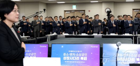 (세종=뉴스1) 김기남 기자 = 한성숙 중소벤처기업부 장관이 12일 세종시 정부컨벤션센터에서 열린 산하기관 업무보고에 참석한 기관장들과 국민의례를 하고 있다. 2026.1.12/뉴스1kinam@news1.krCopyright ⓒ 뉴스1. All rights reserved. 무단 전재 및 재배포, AI학습 이용 금지.
