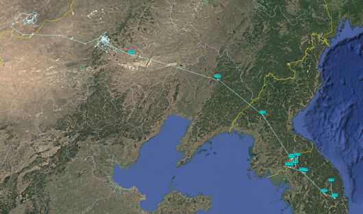 울산에서 구조돼 지난해 4월 방사된 윙태그(Wing Tag) 96-1번 독수리가 지난달 1일 내몽골에서 출발해 철원을 거쳐 안동까지 이동한 경로 [녹색에너지촉진시민포럼 제공] |