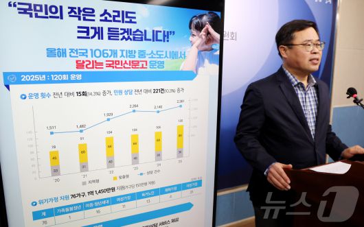 (세종=뉴스1) 김기남 기자 = 양용석 국민권익위원회 달리는국민신문고 팀장이 12일 세종시 정부세종청사에서 달리는 국민신문고 운영 결과 및 향후 계획을 발표하고 있다. 국민권익위는 2025년 달리는 국민신문고를 총 120회 운영하여 2,361건의 민원을 상담하였고, 2026년에는 전국 106개 이상의 지방 중소도시를 찾아가 달리는 국민신문고를 운영할 계획이라고 밝혔다. 2026.1.12/뉴스1