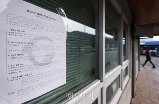 서울 버스노조가 13일 첫차부터 총파업을 예고한 가운데 12일 서울 은평구 진관공영차고지에 2025년 임단투 총파업 투쟁지침이 붙어 있다. 서울지방노동위원회는 이날 오후 3시 전국자동차노동조합연맹 서울시버스노동조합의 노동쟁의와 관련한 특별조정위원회 사후 조정회의를 연다. 노사는 지난해부터 임금·단체협약(임단협) 교섭을 이어왔으나, 최근까지 수차례 실무 협상에서도 이견을 좁히지 못한 상태다. 조현호 기자 hyunho@