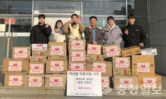 충북 진천군 덕산읍 피어나라 태권도장 정경규 관장 등이 12일 덕산읍 행정복지센터에 저소득층 가구를 해 사용해 달라며 사랑의 라면 40박스(60만원 상당)를 기탁했다.