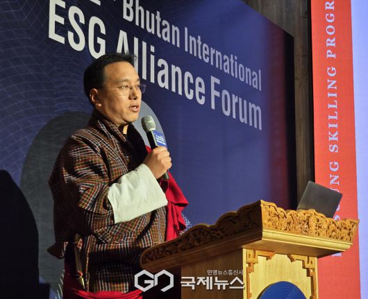 (부탄=국제뉴스) 유지현 기자 = 10일 부탄 팀푸시 부탄왕립대학교(RUB)에서 열린 제2회 부탄 국제 ESG 동맹포럼(The 2nd Bhutan International ESG Alliance Forum) 2일차 행사에서 Dasho Tashi Dorji 데수웅 스킬링 프로그램(DSP) 의장 겸 겔레푸마인드풀니스시티(GMC) 영적책임자가 데수웅 스킬링 프로그램을 주제로 발표했다.