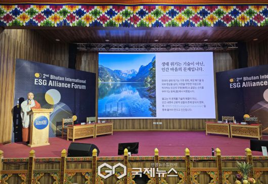 (부탄=국제뉴스) 유지현 기자 = 10일 부탄 팀푸시 부탄왕립대학교(RUB)에서 열린 제2회 부탄 국제 ESG 동맹포럼(The 2nd Bhutan International ESG Alliance Forum) 2일차에서 해인사 승가대학 교수 원걸스님이 '불교 생태철학의 이론과 한국 불교 환경운동'을 주제로 기조강연을 했다.