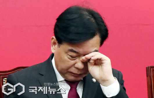 (서울=국제뉴스) 송언석 국민의힘 원내대표가 12일 서울 여의도 국회에서 열린 최고위원회의에서 눈을 비비고 있다./사진=이용우 기자