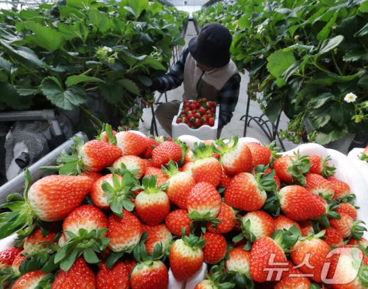 (화성=뉴스1) 김영운 기자 = 영하권의 날씨가 이어지고 있는 12일 경기 화성시의 한 딸기농장에서 관계자가 딸기를 수확하고 있다. 2026.1.12/뉴스1
