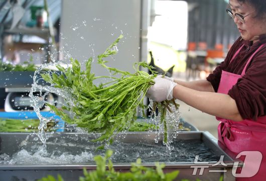 (대구=뉴스1) 공정식 기자 = 한파가 이어진 12일 대구 동구 미대동 논골농원에서 팔공산 미나리를 세척하고 있다. 팔공산 미나리는 해발 200m 이상 팔공산 자락의 공기와 150m 암반 지하수를 이용해 친환경 공법으로 재배된다. 아삭한 식감과 진한 향이 일품이며, 건강식품으로 인기를 끌고 있다. 2026.1.12/뉴스1