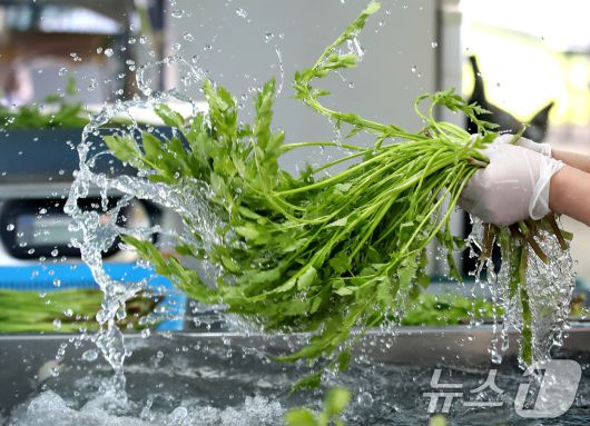 (대구=뉴스1) 공정식 기자 = 한파가 이어진 12일 대구 동구 미대동 논골농원에서 팔공산 미나리를 세척하고 있다. 팔공산 미나리는 해발 200m 이상 팔공산 자락의 공기와 150m 암반 지하수를 이용해 친환경 공법으로 재배된다. 아삭한 식감과 진한 향이 일품이며, 건강식품으로 인기를 끌고 있다. 2026.1.12/뉴스1