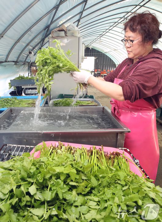 (대구=뉴스1) 공정식 기자 = 한파가 이어진 12일 대구 동구 미대동 논골농원에서 팔공산 미나리를 세척하고 있다. 팔공산 미나리는 해발 200m 이상 팔공산 자락의 공기와 150m 암반 지하수를 이용해 친환경 공법으로 재배된다. 아삭한 식감과 진한 향이 일품이며, 건강식품으로 인기를 끌고 있다. 2026.1.12/뉴스1