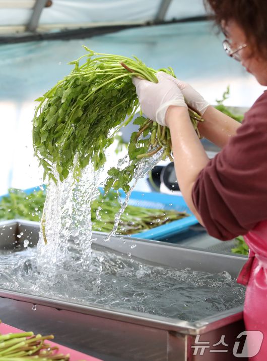 (대구=뉴스1) 공정식 기자 = 한파가 이어진 12일 대구 동구 미대동 논골농원에서 팔공산 미나리를 세척하고 있다. 팔공산 미나리는 해발 200m 이상 팔공산 자락의 공기와 150m 암반 지하수를 이용해 친환경 공법으로 재배된다. 아삭한 식감과 진한 향이 일품이며, 건강식품으로 인기를 끌고 있다. 2026.1.12/뉴스1