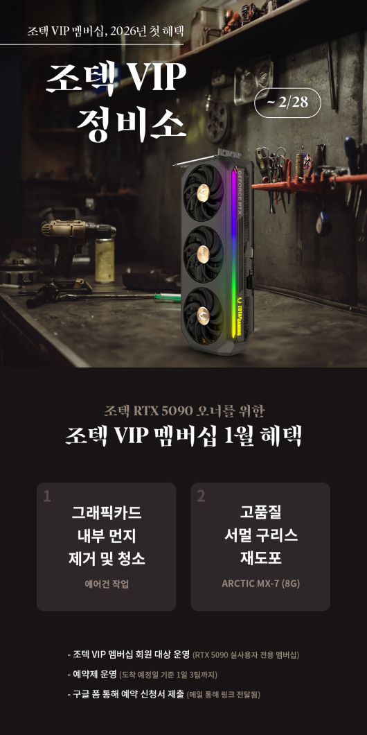 지포스 그래픽카드 전문 기업 조텍코리아는 조텍 VIP 멤버십 회원 대상으로 정밀 점ㄱ머 및 클리닝 서비스를 제공하는 ‘조텍 VIP 정비소’를 진행한다.