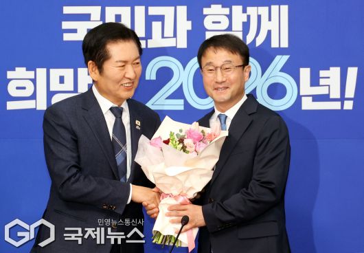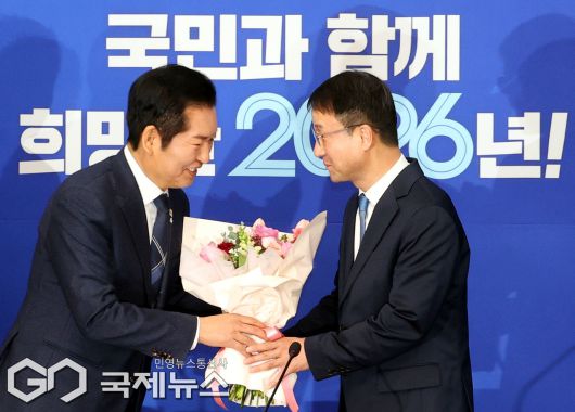 (서울=국제뉴스) 정청래 더불어민주당 대표와 한병도 원내대표가 12일 오전 서울 여의도 국회에서 열린 최고위원회의에서 꽃다발을 들고 기념 촬영을 하고 있다./사진=이용우 기자