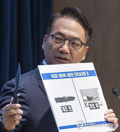 (서울=연합뉴스) 황광모 기자 = 더불어민주당 박선원 의원이 12일 국회 소통관에서 지난 2024년 이재명 대통령이 민주당 대표 당시 부산 가덕도 공항 건설 예정지 방문에서 당한 피습사건 관련 기자회견에서 당시 범인이 사용한 흉기와 군용칼의 유사성에 대해 설명하고 있다.