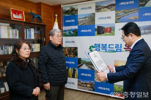 황규철 옥천군수가 고 송재남 하사의 장남 송완영씨 부부에게 화랑무공훈장을 전수하고 있다. |