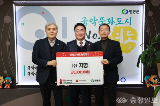 ㈜지명이 12일 영동군청을 방문해 연말을 맞아 지역 어려운 이웃을 돕기 위한 사랑의 성금 300만원을 기탁했다.