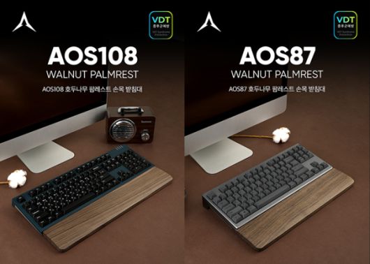 AOS108과 AOS87은 짙은 밤색 컬러가 돋보이는 호두나무 원목을 사용해 차분하면서도 고급스러운 분위기를 연출하는 키보드 팜레스트다. 단순한 손목 받침대를 넘어 데스크테리어의 완성도를 높여주는 아이템으로 호두나무 원목 특유의 결을 살린 디자인이 키보드와 자연스럽게 어우러져 정돈된 데스크 환경을 선호하는 사용자에게 높은 만족도를 제공할 것으로 기대된다.