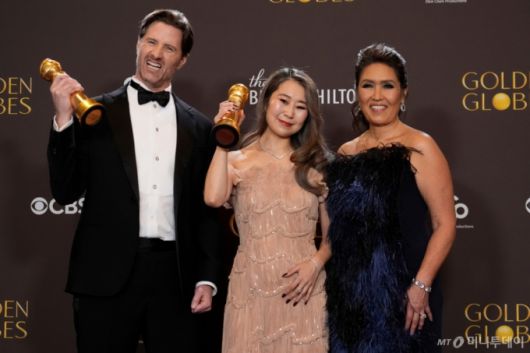 [베벌리힐스=AP/뉴시스] 매기 강(가운데) 감독이 11일(현지 시간) 미 캘리포니아 로스앤젤레스 베벌리힐스의 베벌리힐튼에서 열린 제83회 골든글로브 시상식에서 '케이팝 데몬 헌터스'(케데헌)로 애니메이션 작품상(장편 애니메이션)을 받은 후 기자실에서 크리스 애펠한스(왼쪽) 공동 연출자, 매기 웡 소니 프로듀서와 기념 촬영을 하고 있다. 2026.01.12. /사진=민경찬 |