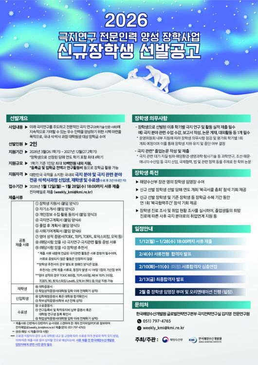 해수부(mof.go.kr), 한국해양수산개발원(kmi.re.kr), 극지종합정보서비스 극지e야기(koreapolarportal.or.kr) 등 누리집에서 확인하고 전자우편(weekly_kmi@kmi.re.kr)으로 지원서 등을 내면 된다. 서류심사와 심층면접을 거쳐 최종 2인의 장학생을 선발한 뒤 2월13일 해수부 누리집에 공고한다.