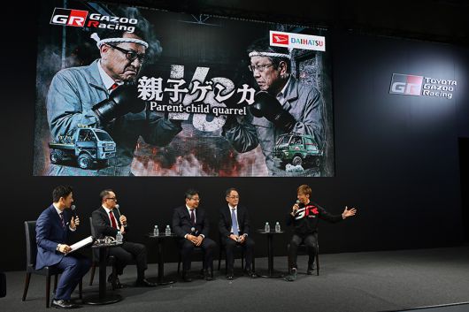 토요타 가주 레이싱(TGR) 부스 무대 스크린에는 권투 글러브를 낀 토요다 아키오 회장과 다이하츠의 이데 케이타(Keita Ide) 사장이 강렬한 인상으로 서로 대치하는 ‘부자싸움(Parent-child quarrel)’의 AI 이미지가 공개되며 모두의 시선을 집중시켰다.