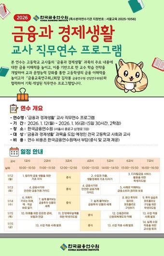연수 과정에서는 '금융과 경제생활' 교과 내용별로 금융 분야 전문가의 강의가 진행되며, 실제 수업 적용 사례와 교수법에 대한 토의 등 현직 고등학교 교사의 강의도 함께 포함된다.