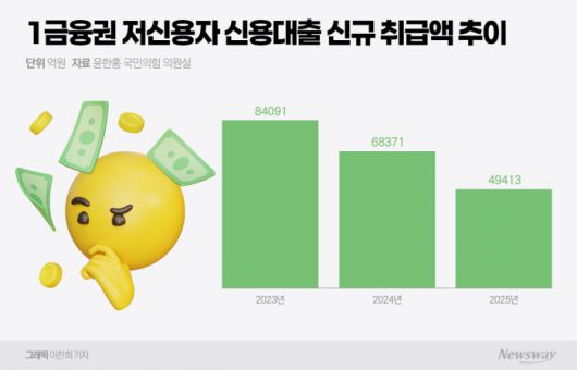 12일 국회 정무위원회 소속 윤한홍 국민의힘 의원실이 나이스신용평가로부터 제출받은 자료에 따르면 지난해(11월 말 기준) 1금융권의 신용점수 750점 이하 차주 대상 신규 신용대출 취급액은 4조9413억원으로 집계됐다. 이는 2023년 8조4091억원, 2024년 6조8371억원에 이어 매년 가파르게 줄어든 수치다. 불과 2년 사이 저신용자에 대한 자금 공급이 반토막난 셈이다.
