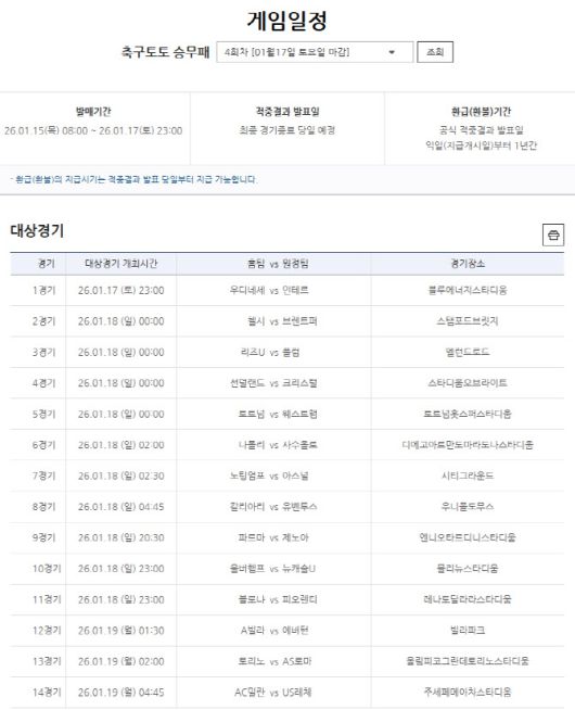 한편, 축구토토 승무패 4회차는 1월 15일 오전 8시부터 17일 오후 11시까지 발매가 진행된다.