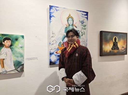(부탄=국제뉴스) 유지현 기자 = 9일 부탄 팀푸시 RTA에서 '제2회 부탄 국제 ESG 동맹포럼' 부대행사로 열린 '부탄왕국 초청 한국 전통 민화전' 개막식에서 작품을 소개하는 부탄 작가 취링 도르지 아스타(Tshering Dorji Asta).