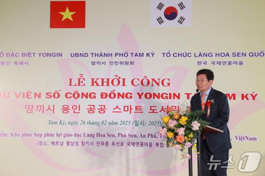 이상일 용인시장이 지난해 2월 26일(현지시각) 베트남 국제연꽃마을에서 진행된 '용인 스마트 디지털도서관' 착공식에서 인사말을 하고 있는 모습.(용인시 제공) |
