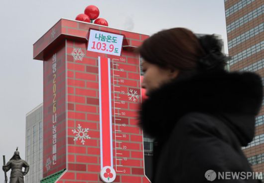 [서울=뉴스핌] 이길동 기자 = 12일 서울 종로구 광화문 광장에 설치된 사랑의 온도탑 나눔온도가 103.9도를 가리키고 있다. 사랑의열매 사회복지공동모금회는 이날 ‘희망 2026 나눔 캠페인’의 사랑의 온도탑 나눔 온도가 100도를 돌파했다고 밝혔다. 11일 자정까지 사랑의 열매를 통해 모두 4,676억 원이 모금돼 목표액인 4,500억 원의 103.9%를 기록했다. 2026.01.12 gdlee@newspim.com