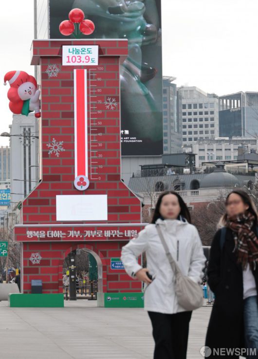 [서울=뉴스핌] 이길동 기자 = 12일 서울 종로구 광화문 광장에 설치된 사랑의 온도탑 나눔온도가 103.9도를 가리키고 있다. 사랑의열매 사회복지공동모금회는 이날 ‘희망 2026 나눔 캠페인’의 사랑의 온도탑 나눔 온도가 100도를 돌파했다고 밝혔다. 11일 자정까지 사랑의 열매를 통해 모두 4,676억 원이 모금돼 목표액인 4,500억 원의 103.9%를 기록했다. 2026.01.12 gdlee@newspim.com