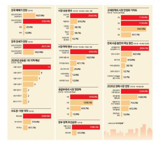 전셋값 상승으로 인해 매매 시장 불안도 가중될 전망이다. 지난해 지방에서는 전셋값이 먼저 오른 뒤 매매가가 나중에 뛰는 패턴이 반복돼 왔는데, 이 패턴이 올해 전국적으로 확산할 가능성이 높은 것이다. 공급 부족이 전셋값을 밀어 올리고, 전세가율이 상승하며 매매가를 다시 자극하는 악순환이 우려되는 대목이다. 전국 매매가 전망 설문에서 응답자의 63.9%(23명)는 '상승하되 지난해보다 그 폭은 둔화할 것'이라고 답했으며, 27.8%(10명)는 '지난해보다 오름 폭이 더 커질 것'이라고 내다봤다. 반면 보합(5.6%, 2명)이나 하락(2.8%, 1명) 의견은 극소수에 불과했다.