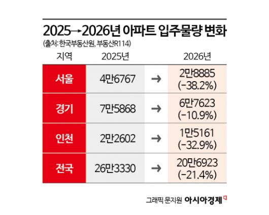 설문에 참여한 한 전문가는 "전세 수급 불안의 핵심 원인은 최근 몇 년간의 인허가·착공 감소가 누적되며 실제 입주 물량이 줄어드는 구조적 공급 부족에 있다"며 "매수 심리 위축이나 아파트 쏠림, 제도 요인도 영향을 미치겠지만 가장 근본적인 요인은 시장에 신규 주택 부족"이라고 진단했다. 한국부동산원과 부동산R114에 따르면 올해 전국 입주 물량은 20만 6923가구로 지난해 대비 21.4% 감소한다. 특히 서울은 4만6767가구에서 2만8885가구로 38.2%가 증발한다.