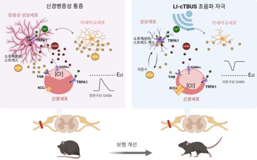 LI-cTBUS가 통증을 완화하는 작동 원리. 왼쪽은 신경병증성 통증 상태에서 나타나는 신경세포와 별세포(성상교세포)의 병리적 변화를, 오른쪽은 LI-cTBUS(저강도 연속 세타버스트 초음파) 자극을 적용했을 때 이러한 변화가 개선되는 과정을 모식도로 나타낸 것. LI-cTBUS는 척수에 위치한 별세포의 TRPA1 기계 감지 채널을 활성화해, 과도하게 반응하던 별세포의 상태를 조절한다. 이 과정에서 별세포는 통증을 악화시키는 신호 단백질인 BDNF를 세포 내부로 흡수해 분해하는 과정(리소좀 경로)을 활성화한다. 그 결과 1)과도하게 증가했던 BDNF–TrkB 신호가 감소하고, 2)신경 흥분 조절 기능을 담당하는 KCC2 단백질의 기능이 정상 수준으로 회복되며, 3)신경세포 안팎의 염화이온 균형이 안정화되고, 4)손상됐던 억제 회로(GABA 억제 회로)가 다시 제 기능을 수행하게 된다. IBS |