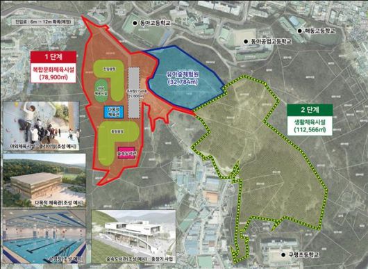 사업은 재정 여건과 실행력을 고려해 두 단계로 나눠 추진된다. 1단계에서는 다목적 실내체육관 1개 동과 야외체육시설, 주차장, 광장 등을 갖춘 복합문화체육시설을 조성한다. 사업비는 약 280억 원으로, 올해 도시계획시설 결정 등 행정절차를 거쳐 실시설계와 토지 매입을 마친 뒤 공사에 착수해 2029년 내 준공을 목표로 한다.