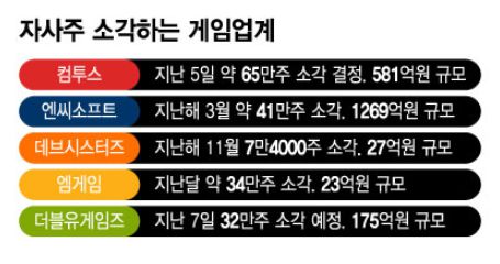 12일 컴투스는 581억원 규모의 자사주를 소각한다. 소각할 자사주는 총 64만6442주로 발행 주식 총수의 5.1%, 보유 자사주의 50%에 달한다. 앞서 더블유게임즈도 지난 7일 175억원 규모의 자사주를 소각했다.