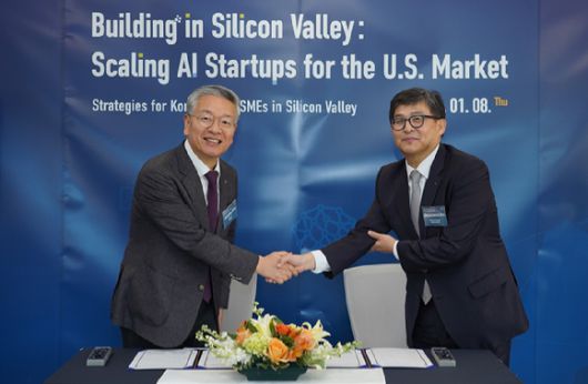 도건우 신한은행 미주지역본부장(오른쪽)과 김종호 기술보증기금 이사장이 8일 기술보증기금의 미국 실리콘밸리 지점에서 기념사진을 촬영하고 있다. [사진=신한은행] |