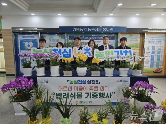 (춘천=뉴스1) 이종재 기자 = 김병용 농협중앙회 강원본부장과 이명호 농협은행 강원본부장이 12일 춘천남부노인복지관을 찾아 취임 축하 화분 300여 개를 기부했다.