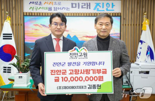 (진안=뉴스1) 김동규 기자 = 전북 진안군은 김종헌 ㈜제이에이치테크 대표가 고향사랑기부금 1000만 원을 기탁했다고 12일 밝혔다.