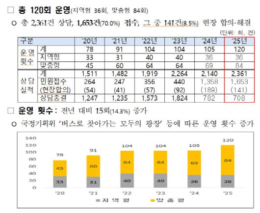 아시아투데이 지환혁 기자 = 국민권익위원회가 생활 속 고충과 불편을 지역 현장에서 직접 상담하는 '달리는 국민신문고'를 올해 106회 이상 운영한다고 12일 밝혔다.